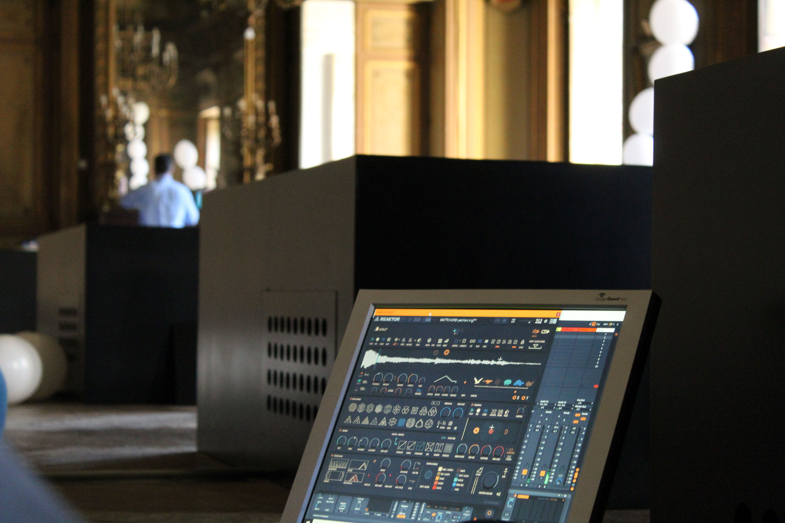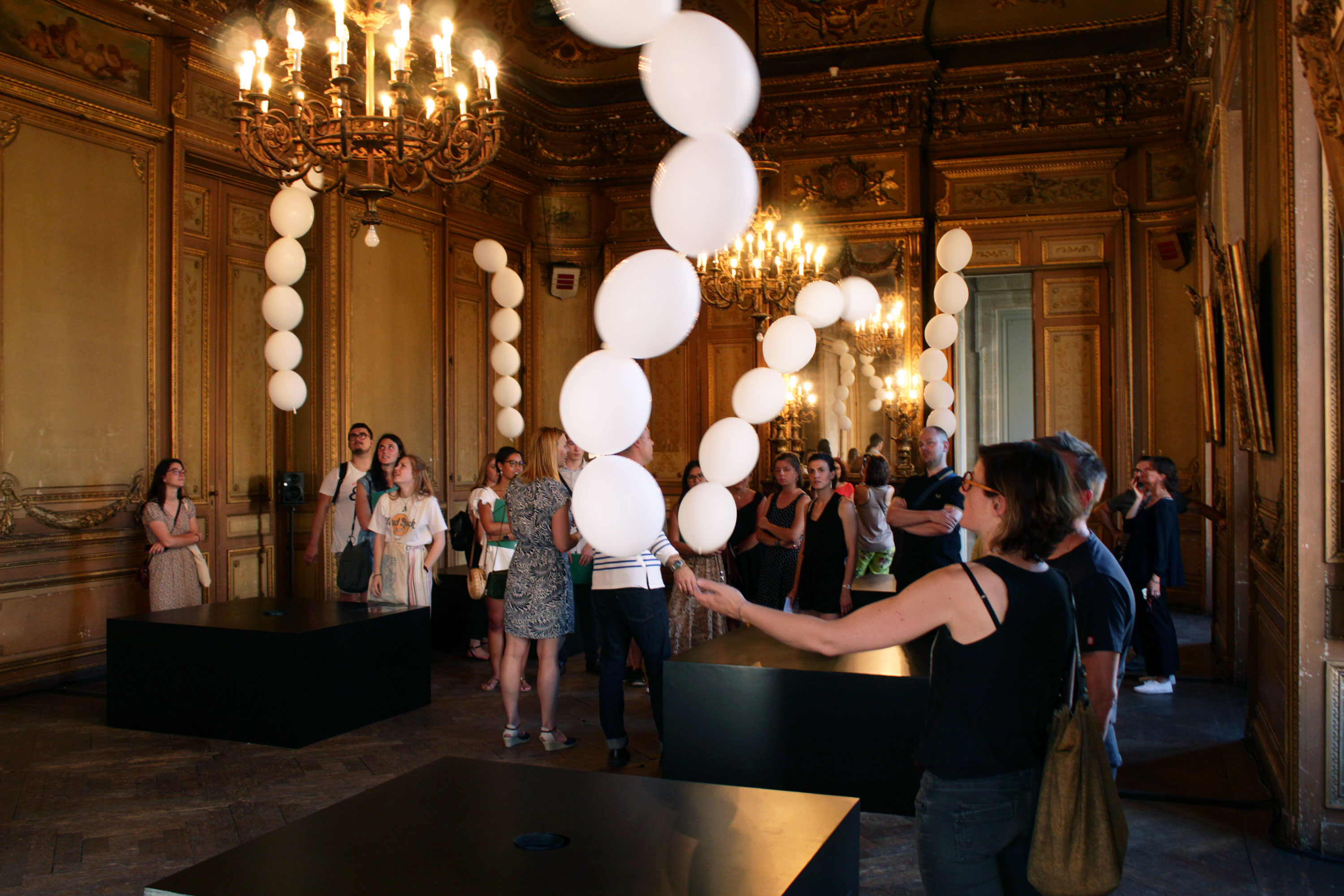 La danse imprévisible des ballons/molécules pris dans un flux d’air finement calibré, ainsi que la déambulation du public, font réagir grâce à un système de capteurs, les machines sonores et génèrent une pièce musicale éthérée et immersive entièrement synthétisée en temps réel, faisant de la partition musicale une réponse, un effet secondaire de la sculpture.