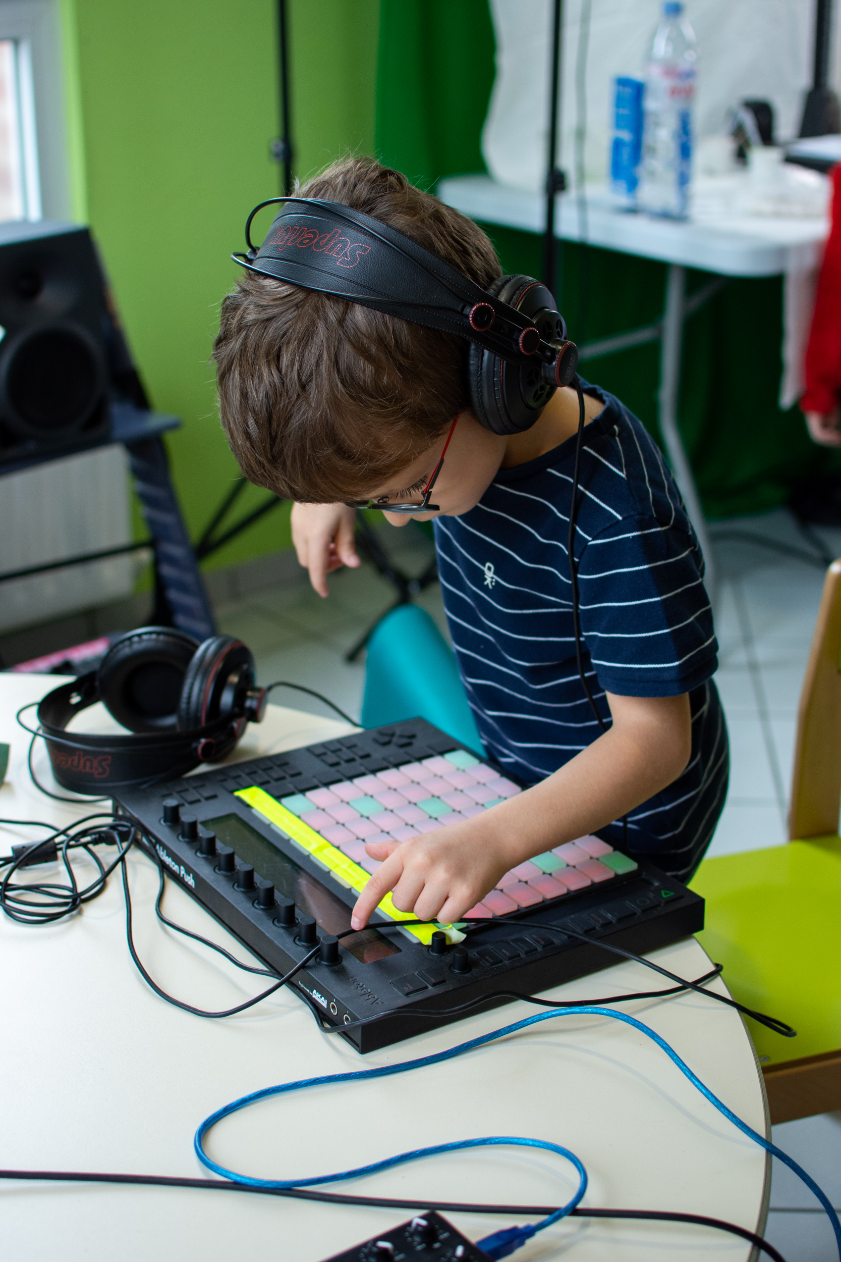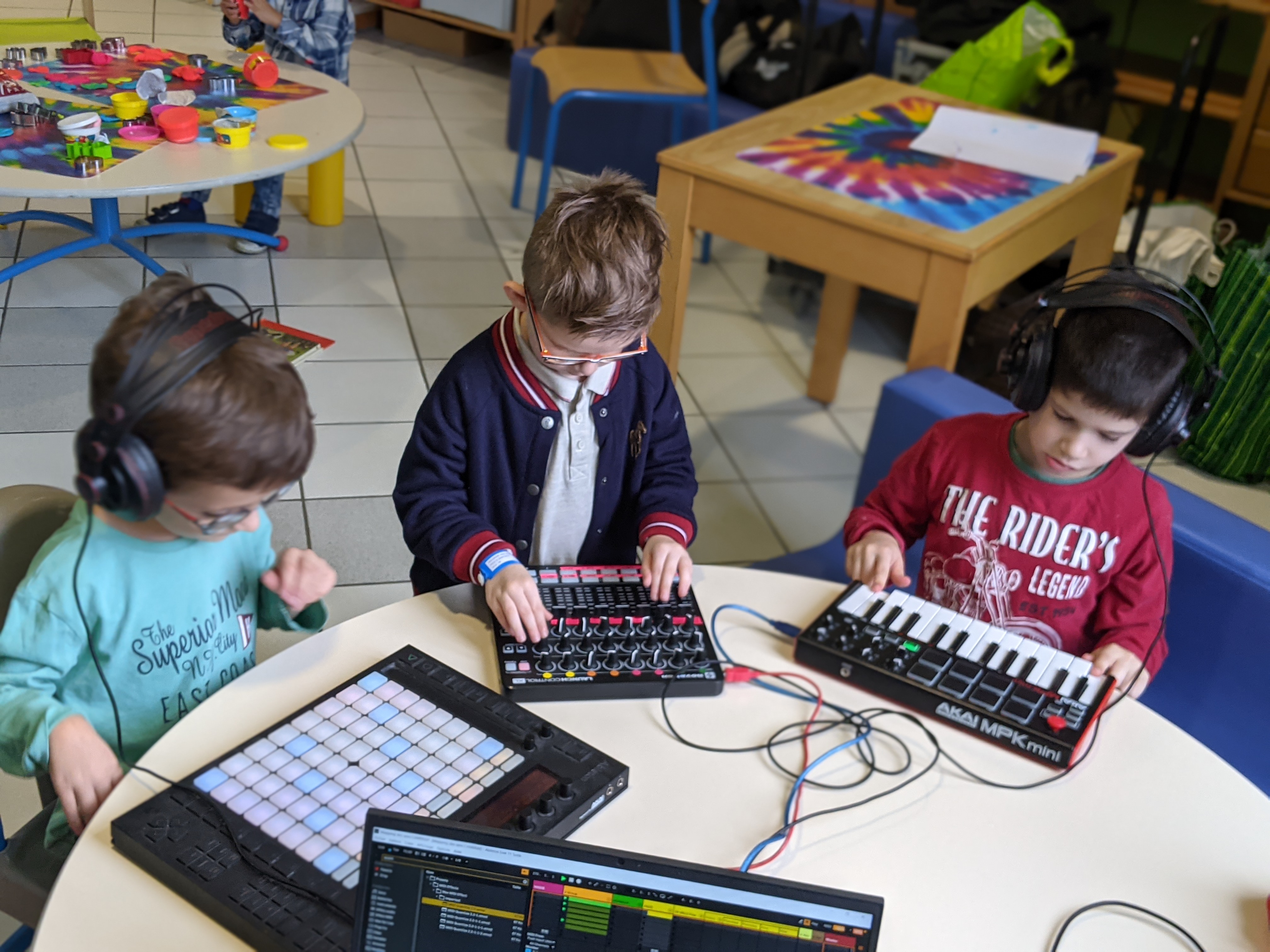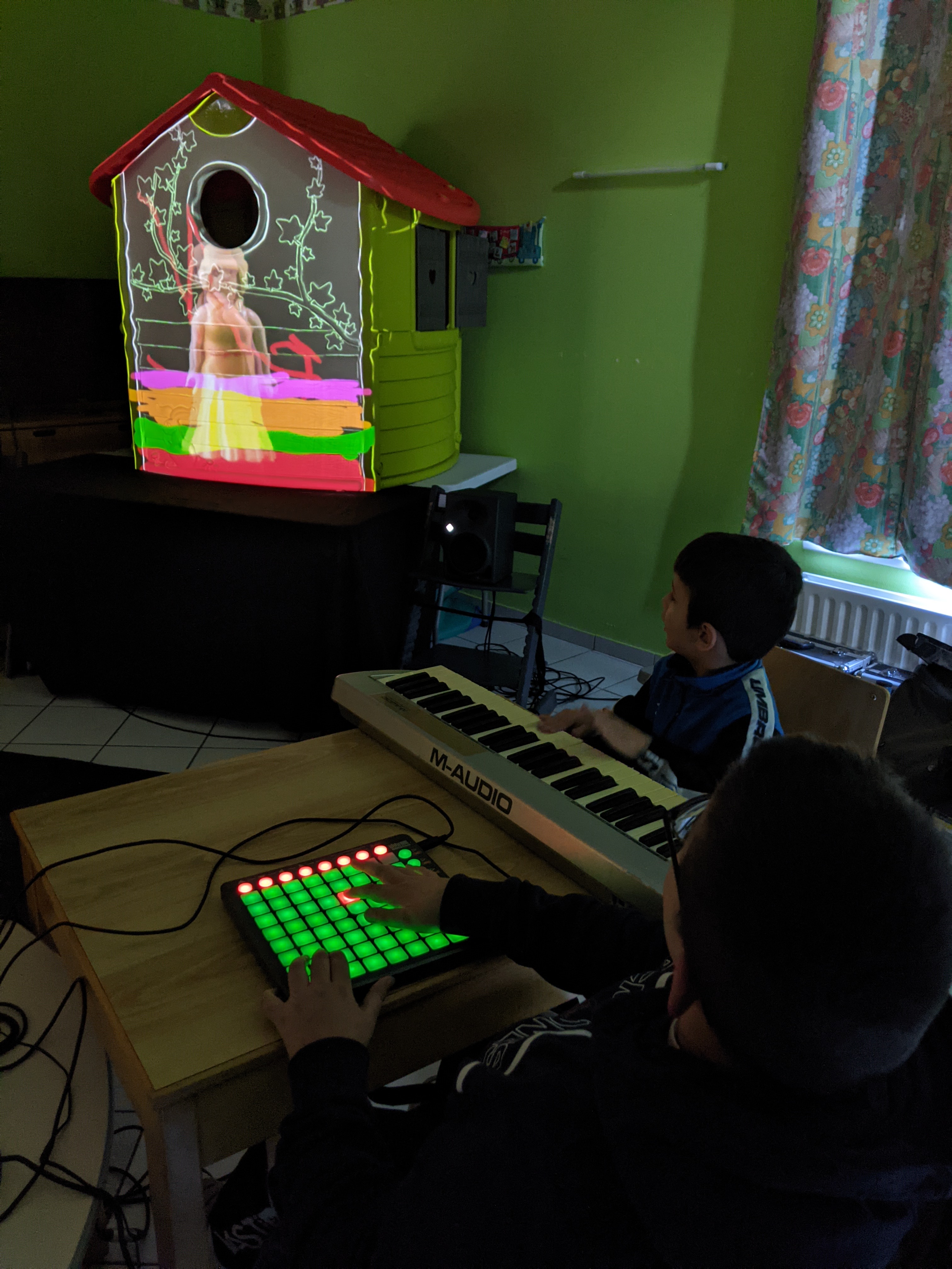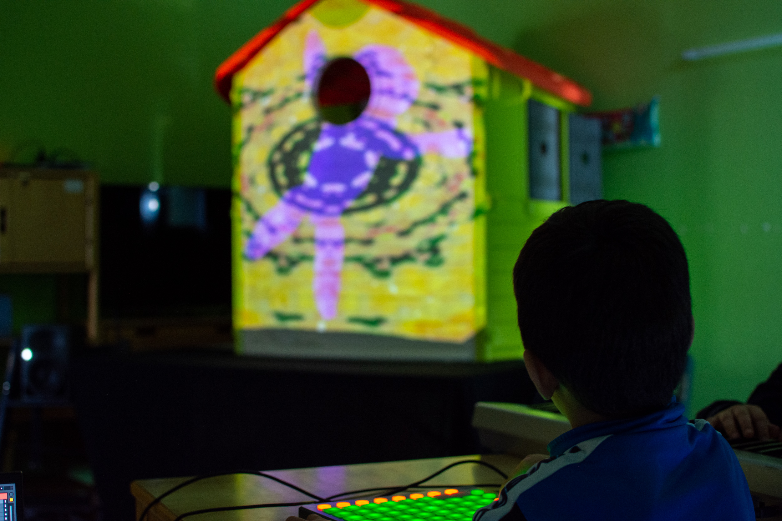 Les participant(e)s ont pu créer, grâce à un ensemble de dispositifs et déroulés adaptés, de la matière sonore et visuelle qu’ils ont ensuite transformée et organisée dans le but de se produire « live », en public, lors d’un spectacle immersif réunissant musique électronique et mapping vidéo.