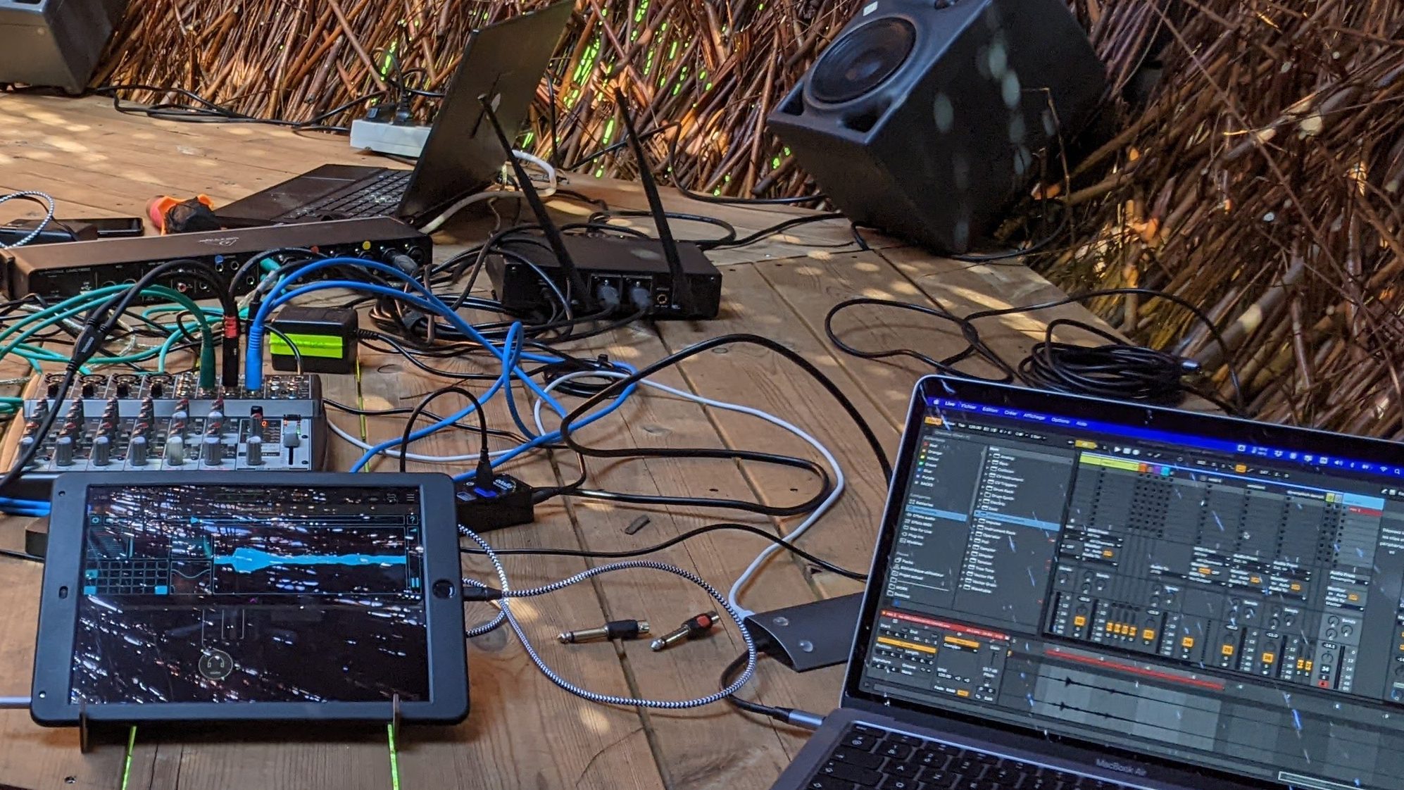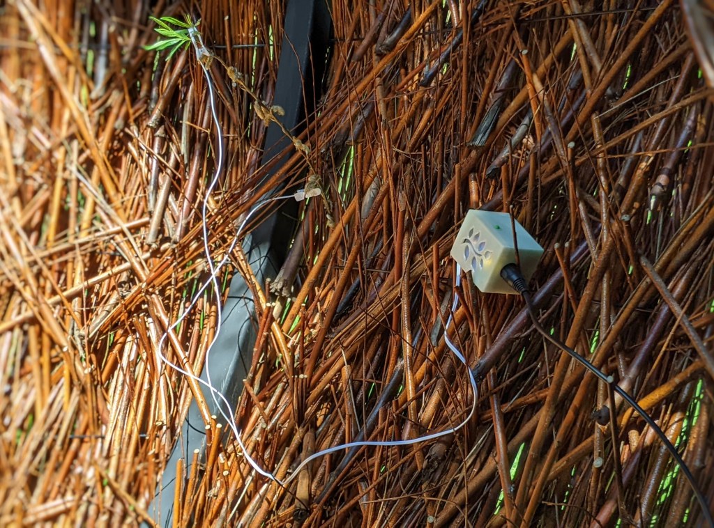 Nous avons investi cette structure de Land Art pour la transformer en un nid sonore géant. Grâce à différents dispositifs et capteurs, les mouvements et interactions du publics, ainsi que le vent ou le champ électrique du saule têtard constituant la sculpture, le public a pu faire éclore des paysages sonores organiques où se rencontrent musique “synthétique” et l’écosystème du site.