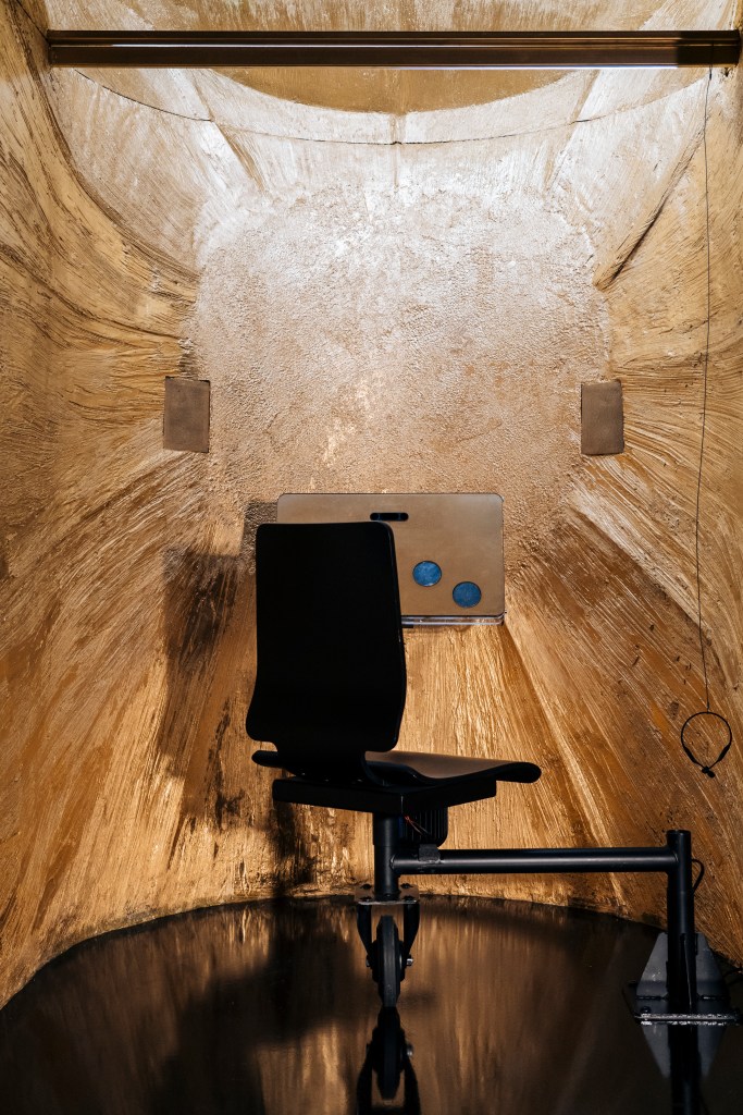 De l’extérieur le spectateur apercevra le scintillement des parois intérieures dorées qui l’inciteront à interagir. Les parois extérieures auront une finition métallique de type métal oxydé, toujours dans l’optique d’imiter la Marcassite. La personne installée à l’intérieur du dispositif aura donc l’opportunité de se laisser aller à la création sonore en pilotant la composition et ses instruments. Différentes techniques de restitution sonore (conduction osseuse, technologie haptique, …) sont employées pour rendre l’expérience à la fois intimiste et immersive, en permettant un quasi silence à l’extérieur malgré de fortes sensations vibratoire à l’intérieur. L’aspect sensoriel est mis au premier plan.